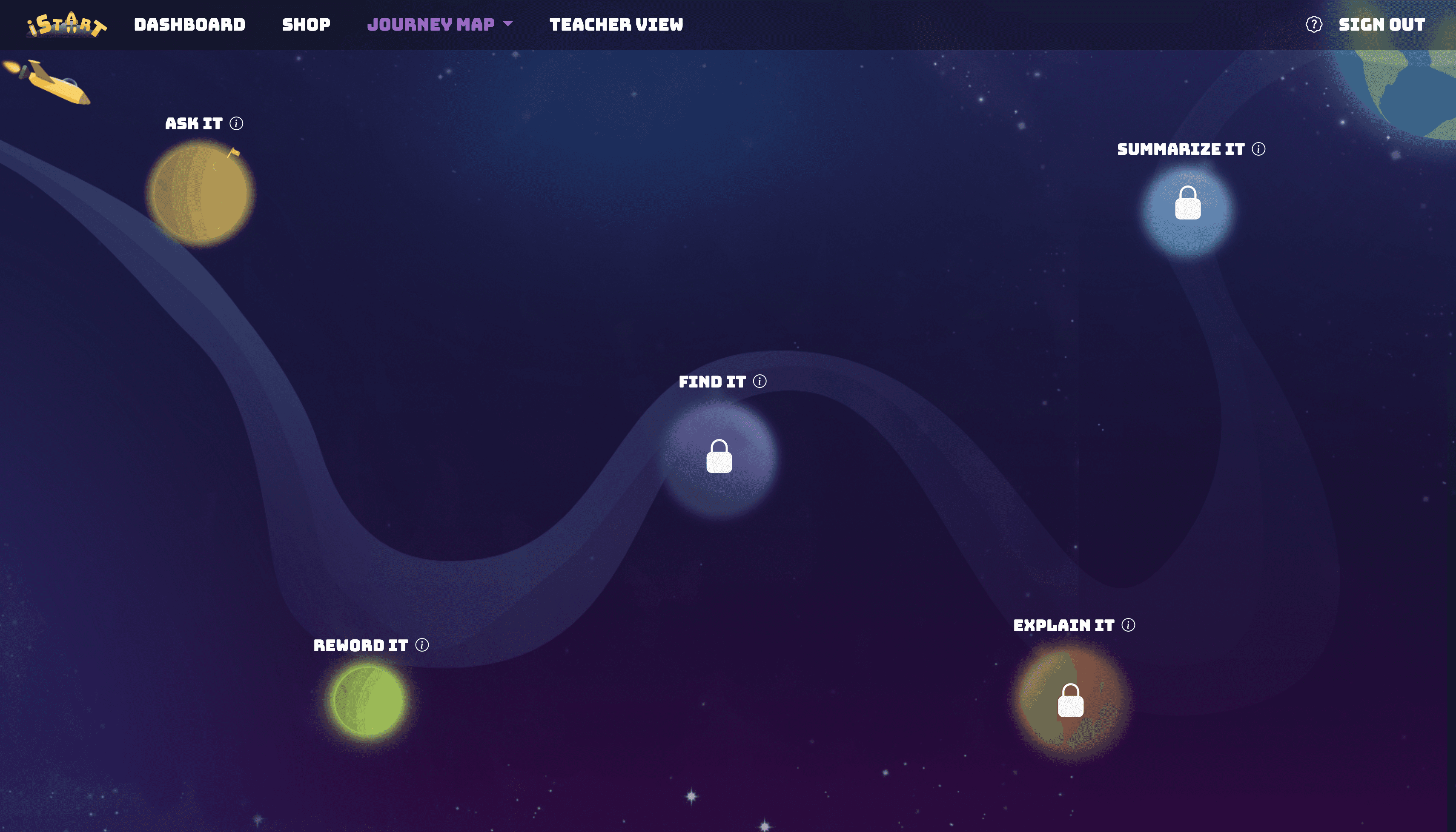 iSTART-Early is a research-based web app designed to help young students to improve their reading comprehension skills. It teaches strategies like question asking, paraphrasing, and self-explanation through gamified modules themed around space exploration.