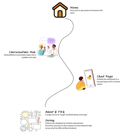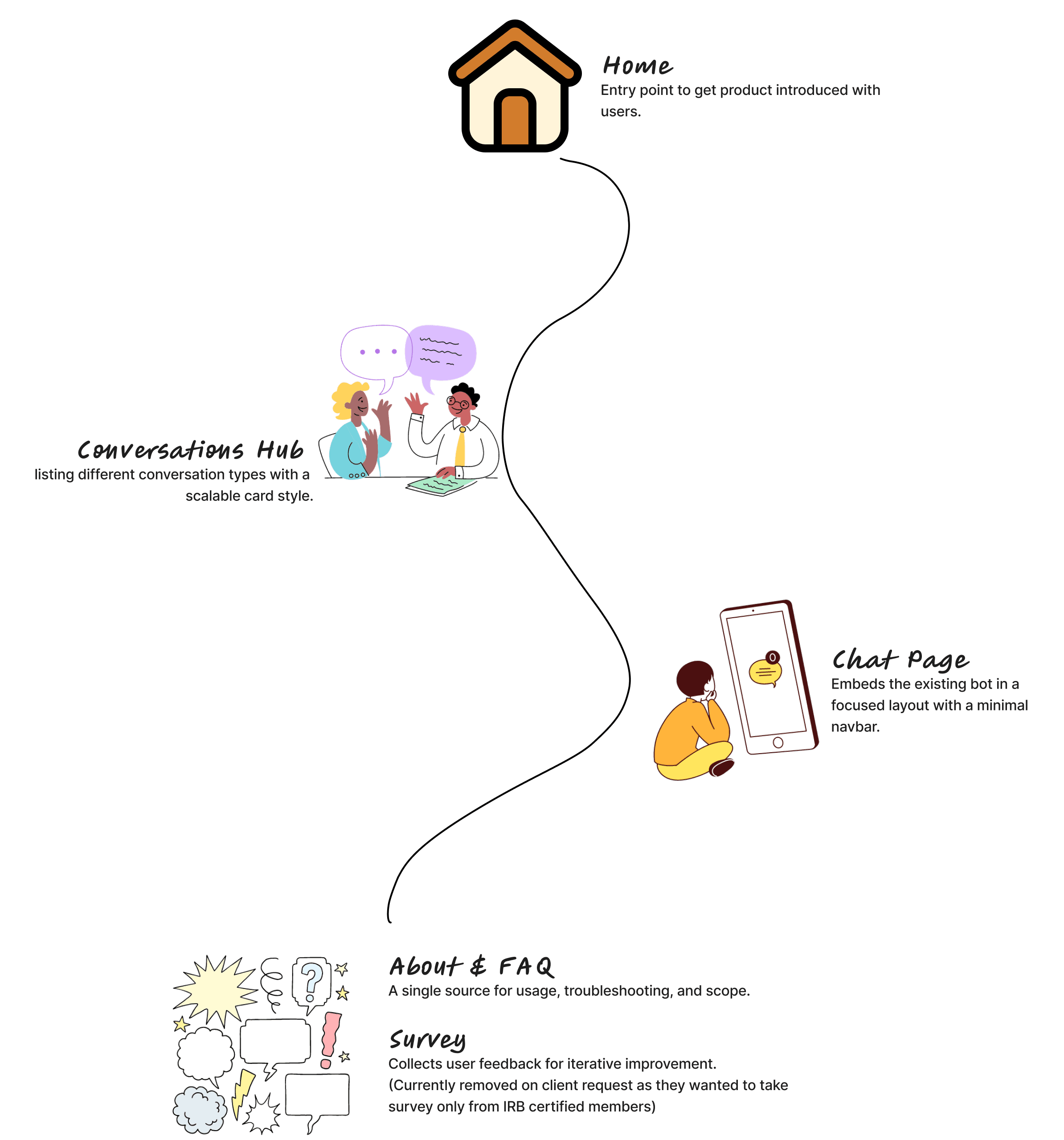 When I joined, the chatbot technically worked but there was no navigation, no onboarding, no way to discover conversation types or gather feedback. Just a single chat interface floating in space.