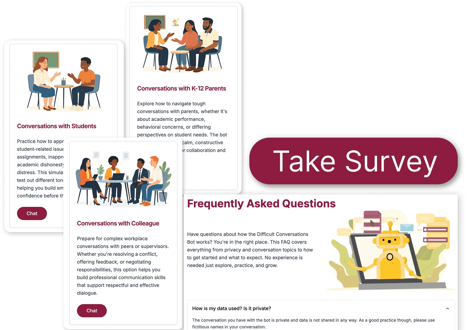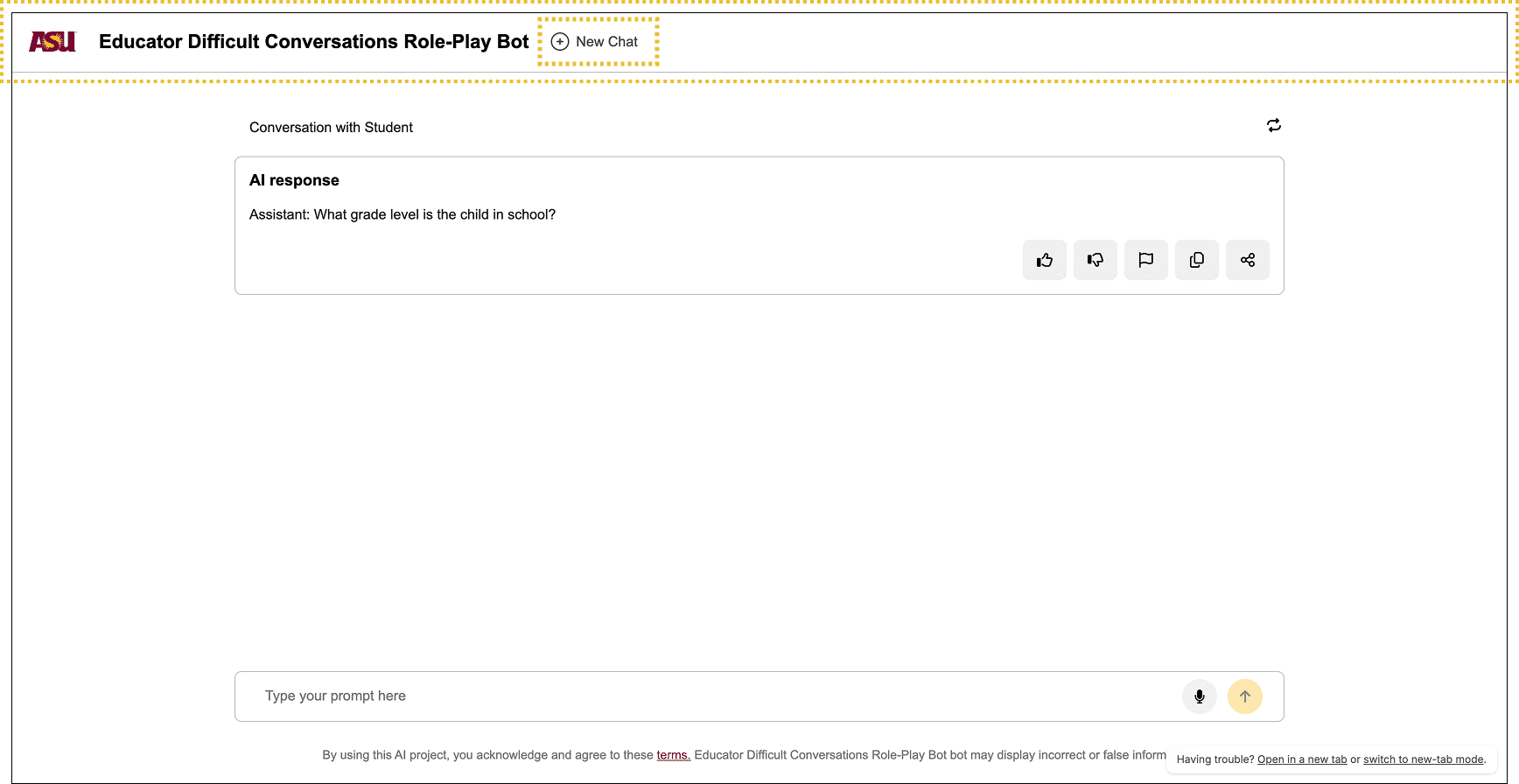 on chat page i want you to remove TodayChallenging Conversation abo...Challenging conversation about...just keep 2 buttons on that panel and i have some content to put in conversation types :Conversations with StudentsPractice how to approach a range of student-related issues; such as missed assignments, inappropriate behavior, academic dishonesty, or emotional distress. This simulation allows you to test out different tones and strategies, helping you build empathy, clarity, and confidence before the real conversation.Conversations with K-12 ParentsExplore how to navigate tough conversations with parents, whether it’s about academic performance, behavioral concerns, or differing perspectives on student needs. The bot helps you rehearse calm, constructive responses that foster collaboration and mutual respect.Conversations with ColleaguePrepare for complex workplace conversations with peers or supervisors. Whether you're resolving a conflict, offering feedback, or negotiating responsibilities, this option helps you build professional communication skills that support respectful and effective dialogue.FAQ's1. How is my data used? Is it private?Answer: The conversation you have with the bot is private and data is not shared in any way. As a good practice though, please use fictitious names in your conversation.2. What types of questions can the bot be used for?Answer: The bot can be used to practice a wide range of difficult conversations, including those with students, parents, or co-workers. Whether you're navigating a sensitive topic, giving constructive feedback, or addressing a conflict, you can choose the scenario that fits your needs. The tool is highly flexible and adaptable to your specific situation, making it useful for a variety of professional and educational contexts.3. How long will it take to complete a conversation with the bot?Answer: The conversation should last less than 15 minutes but you are free to continue the conversation as long as you see fit.4. Do I need any special training to use the bot?Answer: No, you do not need any special training to use the bot. It’s designed to be user-friendly and accessible, even if you have no prior experience with AI or simulations.5. What guidelines does the bot use to engage in conversation with me?Answer: The bot uses the Principled Innovation framework from ASU, which draws on moral, civic, intellectual, and performance assets to guide conversations that create positive change for humanity. Rooted in psychological theories of Humanism, the bot fosters empathy, respect, and personal growth by emphasizing the inherent worth and dignity of each individual. This approach supports ethical decision-making and encourages constructive dialogue grounded in compassion and shared human values.6. What is the purpose of the bot?Answer: The bot is designed to simulate a realistic difficult conversation so you can practice how to respond effectively. By rehearsing and exploring different strategies in a safe environment, you’ll feel more prepared and confident, which will ultimately increase your chances of a successful real-life interaction.7. After I finish the bot is there anything I need to do?Answer: Yes, we’d like you to complete a short survey to share your experience. Your feedback helps us improve the bot and make it more useful for future users.8. Can the bot give me advice or make decisions for me?Answer: No, the bot does not provide advice or make decisions for you. It is designed to simulate conversations and help you explore different ways to approach difficult situations. The goal is to help you reflect, rehearse, and build confidence in your own communication skills.9. What if I make a mistake during the conversation?Answer: That’s okay! This is a safe space to learn and grow. The purpose of the simulation is to explore different approaches without any real-world consequences. You’re encouraged to try new strategies, rephrase responses, or even restart the conversation at any time.10. Can I revisit the bot to practice again later?Answer: Absolutely. You’re welcome to return and practice different types of conversations whenever you’d like. Repetition and reflection are key to building confidence and improving communication skills over time.